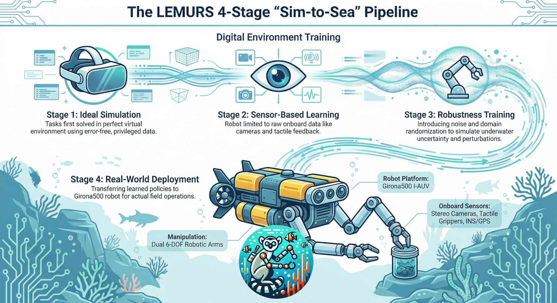 Our methodology follows a structured four-stage pipeline to enable a reliable transition from simulation to real ocean conditions. First, idealized tasks would be solved in a perfect virtual environment using privileged, noise-free data. The robot would then be restricted to onboard sensing only, such as vision and tactile feedback. Next, noise and domain randomization would be introduced to improve robustness against real-world uncertainty. Finally, real trajectory data would be incorporated and the learned policies transferred to the physical Girona 500 I-AUV for field deployment.